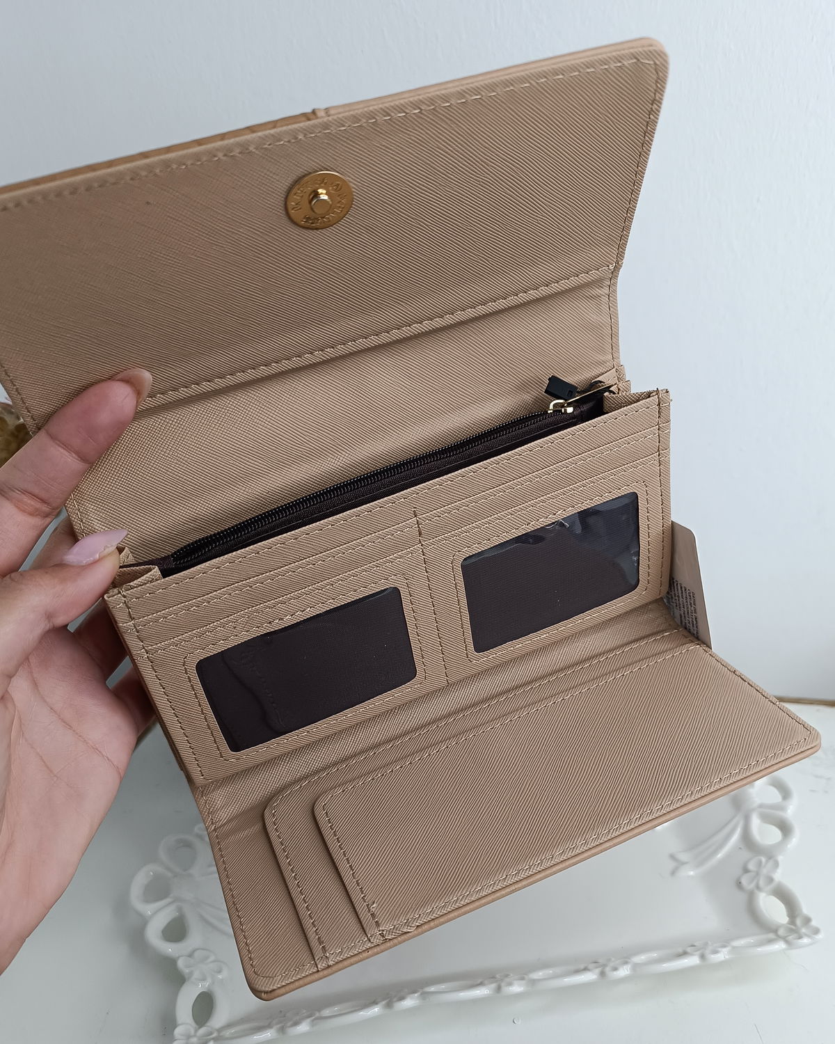 Tres compartimentos, monedero, espacio para tarjetas y DNI